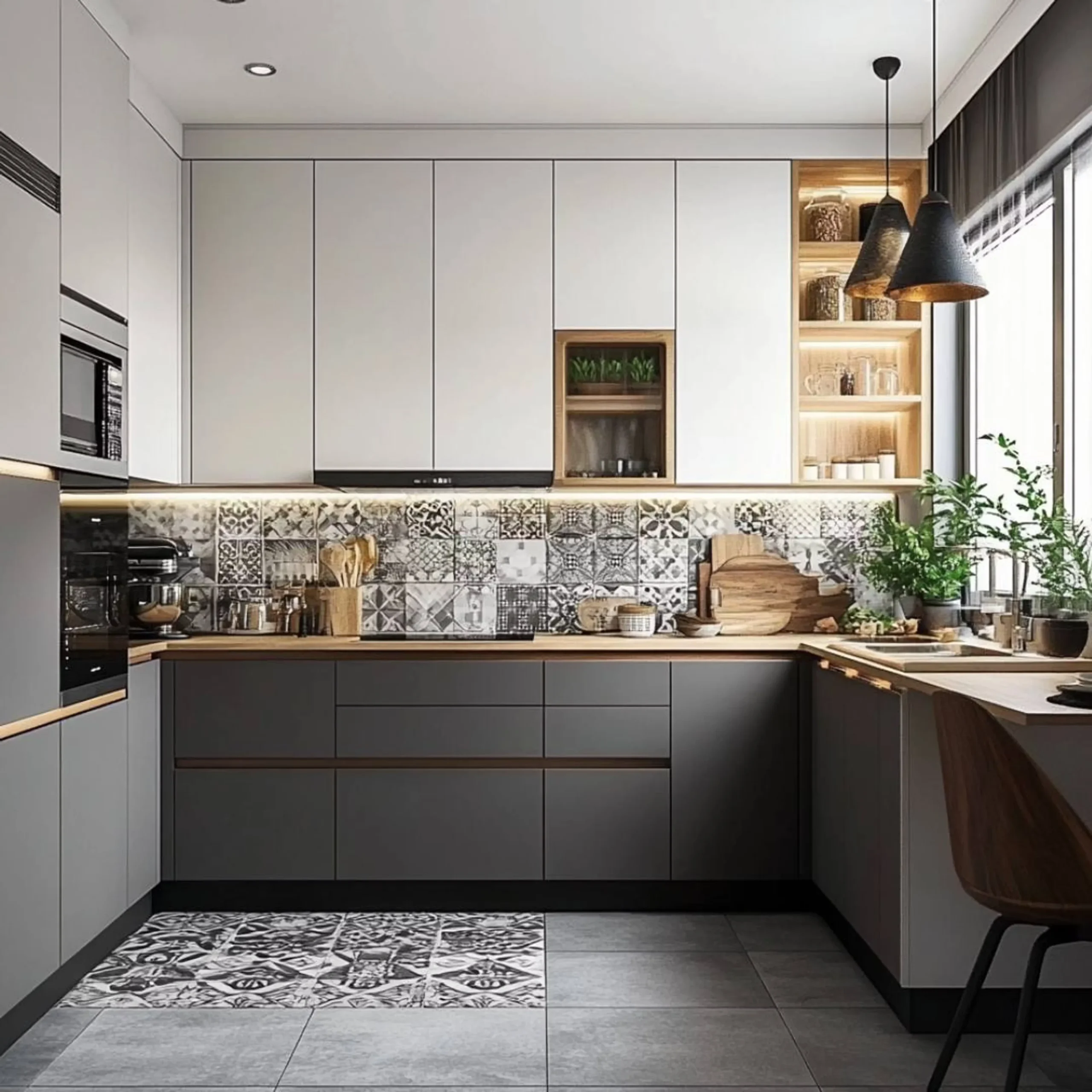 A U-shaped kitchen is a kitchen design with work-spaces on three sides with cabinets. It’s an efficient design that provides plenty of work space and allows for ample storage. Designed to be user-friendly and clutter-free, this kitchen design keeps all your appliances or cooking essentials perfectly in place. U-shaped kitchens from Inneninterior are 100% customized to fit the space. You can visit one of our showrooms in Kerala, Karnataka, Maharashtra, Tamil Nadu and Telangana to view and discuss with our interior designers. Have a look at some of our stunning U-shaped kitchen designs below.